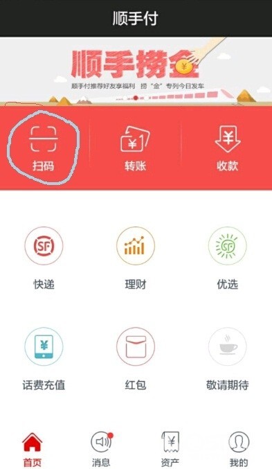 你打开顺手付APP,点击”扫码“,扫快递员给你的二维码: