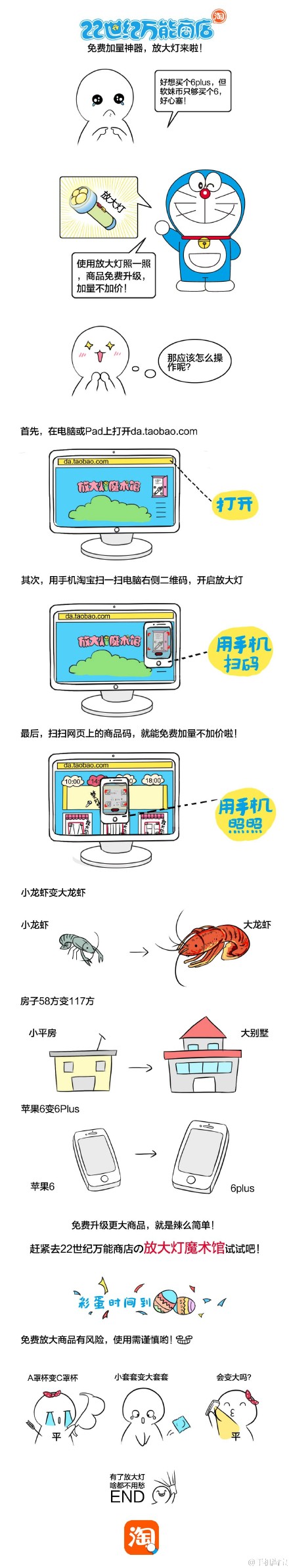 在指定淘宝22世纪万能商店活动页面,点击下方“开启放大灯”,打开放大等道具,照照网页的商品码即可买到更大份量的商品。