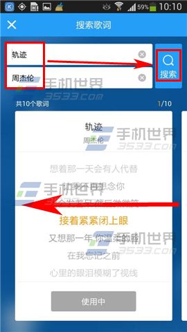 2)输入歌名和歌手名,点击【搜索】,搜索结果可以滑动查看,找到满意的歌词点击【使用】就可以了。(如下图)