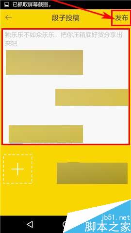 2)点击【段子】,然后点击下方的编辑框输入段子,最后点击右上角的【发布】即可。(如下图)