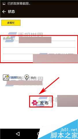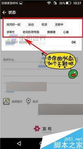 2)点击上方选择标签,接着点击下方的编辑框输入状态,最后点击下方的【发布】即可。(如下图)