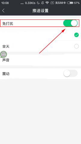 2)然后再点击【推送设置】,接着找到免打扰点击旁边的【按钮】。(如下图)