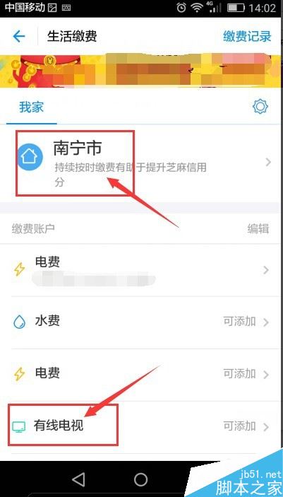 进入生活缴费的页面后,点击选择你所在的城市,然后点击如下图所示的“有线电视”那一栏,添加你家的有线电视信息。
