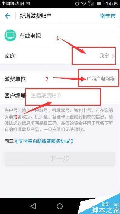 进入新增缴费账户页面后,有三个选项,第一个选项是选择家庭的类型;第二个选项是选择缴费的单位;第三个选项是填写客户编号,这个编号可以是你们家的机顶盒号、你家的缴费编号或者智能卡号都可以。如下图所示,一一填写完毕即可。填写完后,点击“下一步”