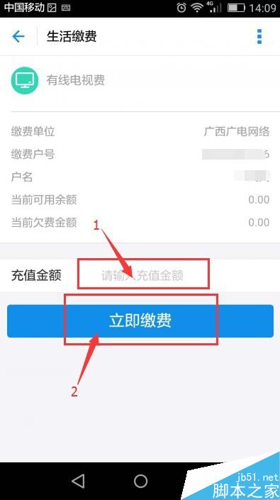 当我们跳入了生活缴费的页面后,就可以看到我们填写的账户信息是不是跟我们所要缴费的账户是不是一致了。如果一致的话,此时再填写你所要充值的金额,然后点击“立即缴费”,如下图所示