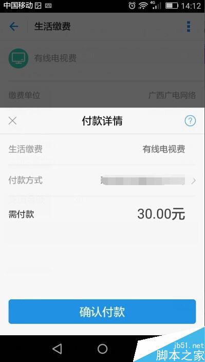 当我们点击立即缴费后,支付宝会弹出支付的页面,此时选择好了付款方式后,可直接点击“确认付款”,如下图所示