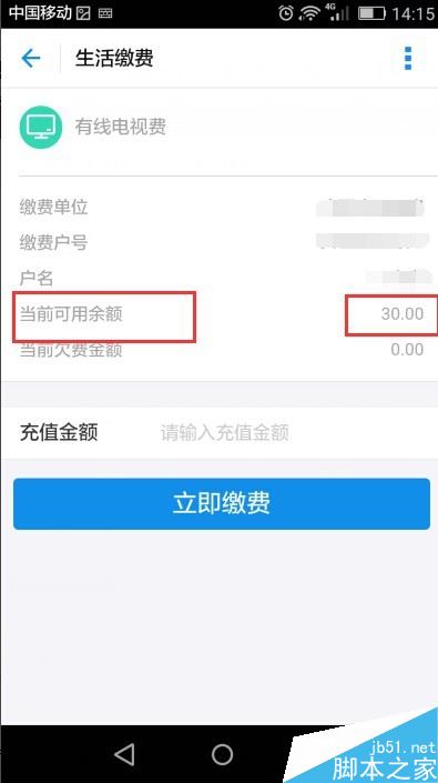 此时你还可以再回头找到生活缴费的有线电视缴费那一栏,查询充值的结果。我今天充值了30元,所以可以看得到如下图所示的结果,这代表已经充值成功了。
