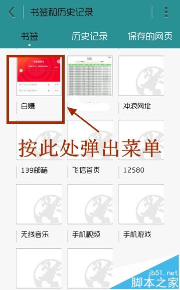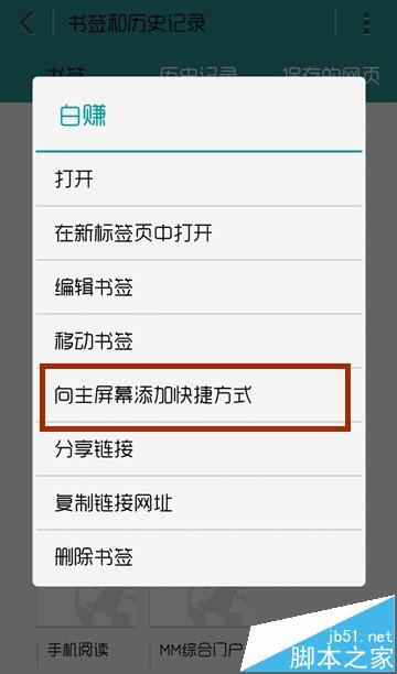 6、保存书签后,进入书签管理,然后将此书签向主屏幕添加快捷方式,不同的手机,保存书签方式略不同。