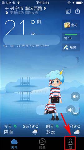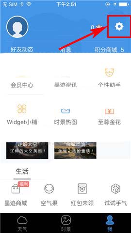 1)点开墨迹天气APP,进入首页右下角的【我】,然后点击右上方的【设置】图标;(如下图)