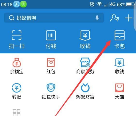 1、在手机上登录支付 宝账户,点击右上方的“卡包"。再点击中部的”券“,如图所示之处。