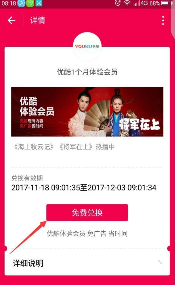 3、进入领取界面,这里显示了领取兑换的有效期,超过了就无法领取。点击”免费兑换“。