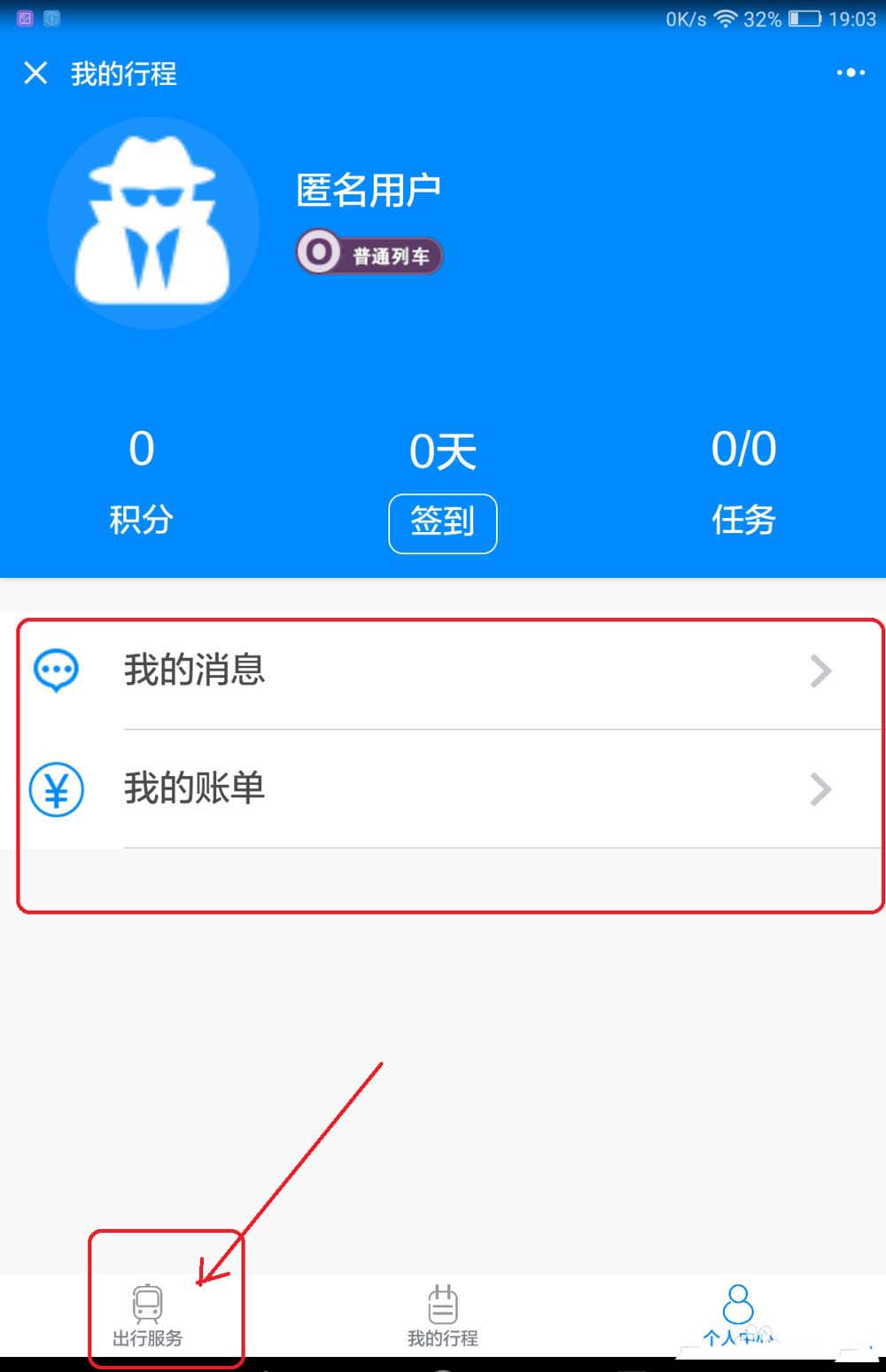4、选择12306程序界面,点击左下角的出行服务,进入出行服务界面,可以查看最近的出行计划行程。