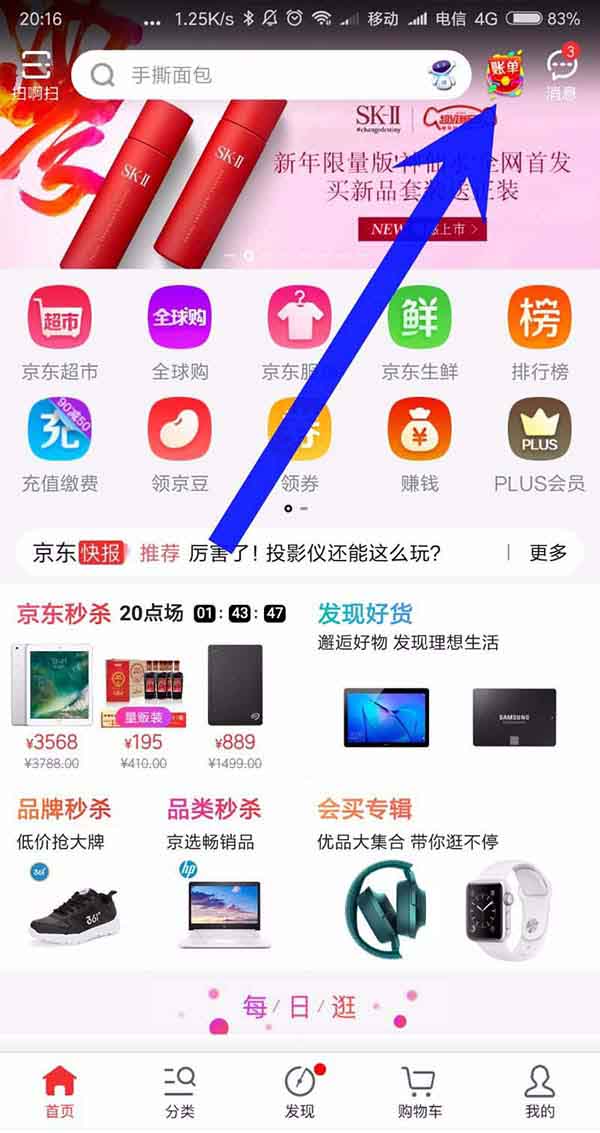 2、进入到京东商城首页之后,上方我们可以看到账单,点击打开