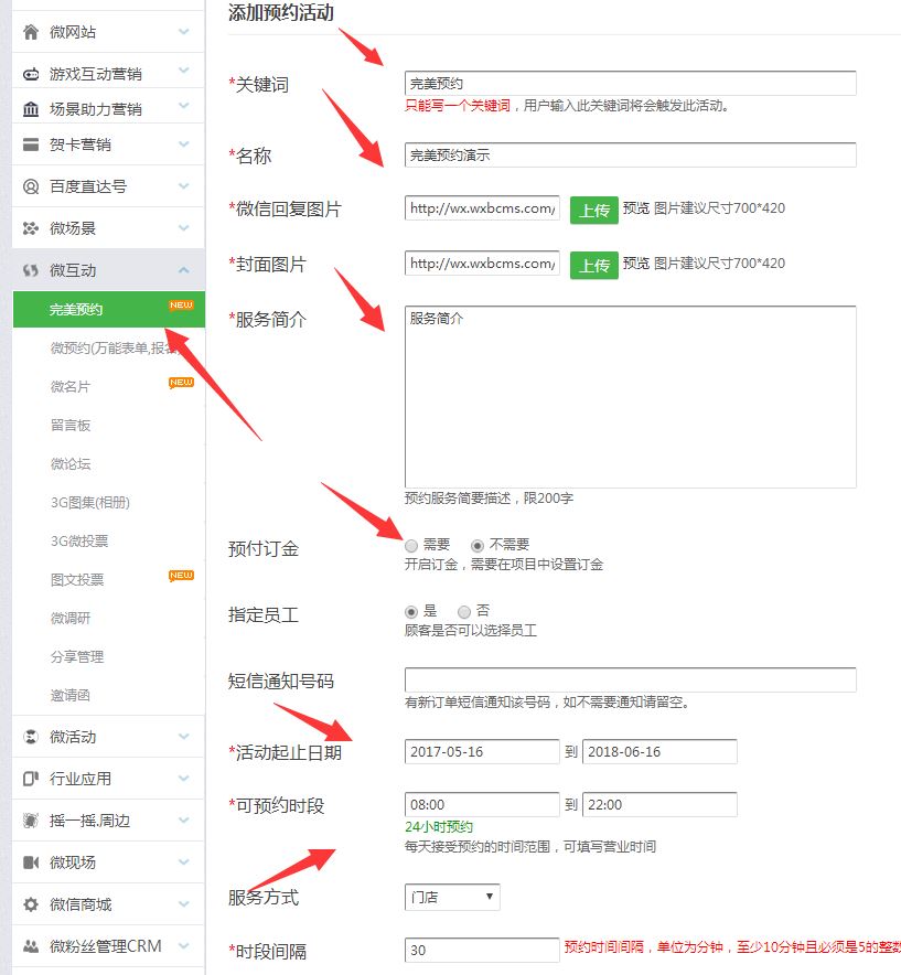 第二步:在左边功能目录里点击微互动---完美预约---添加预约,选择到店或者上门服务,还可以实现在线支付定金,完善活动的设置内容,勾选好对应的选项然后保存。