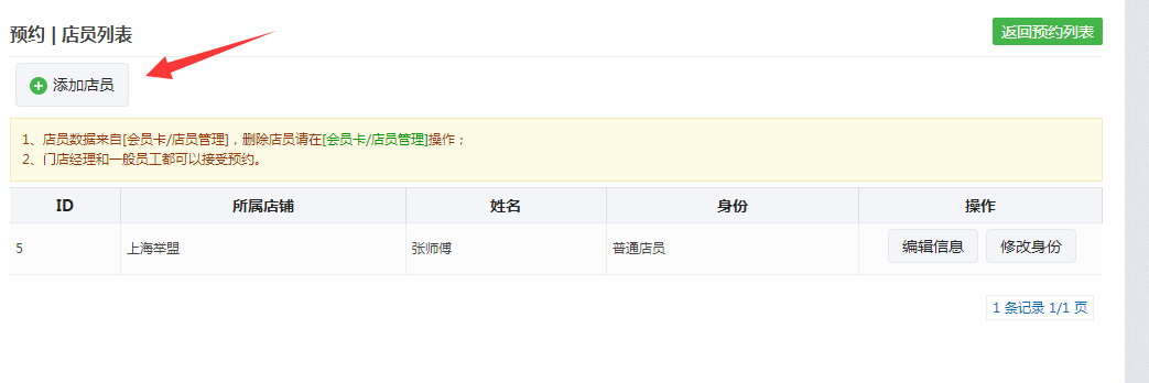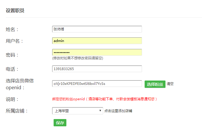 第三步:点击--店员管理--添加店员,填写姓名等信息,选择粉丝的Openid和门店,然后保存,可以多次添加店员。(需要先在基础设置---LBS商家连'锁,里面提交门店信息。)