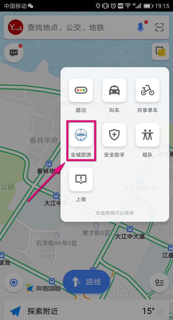 3、点击三个点之后,就会出现展开一个如图所示的页面,在页面中点击【全域旅游】。