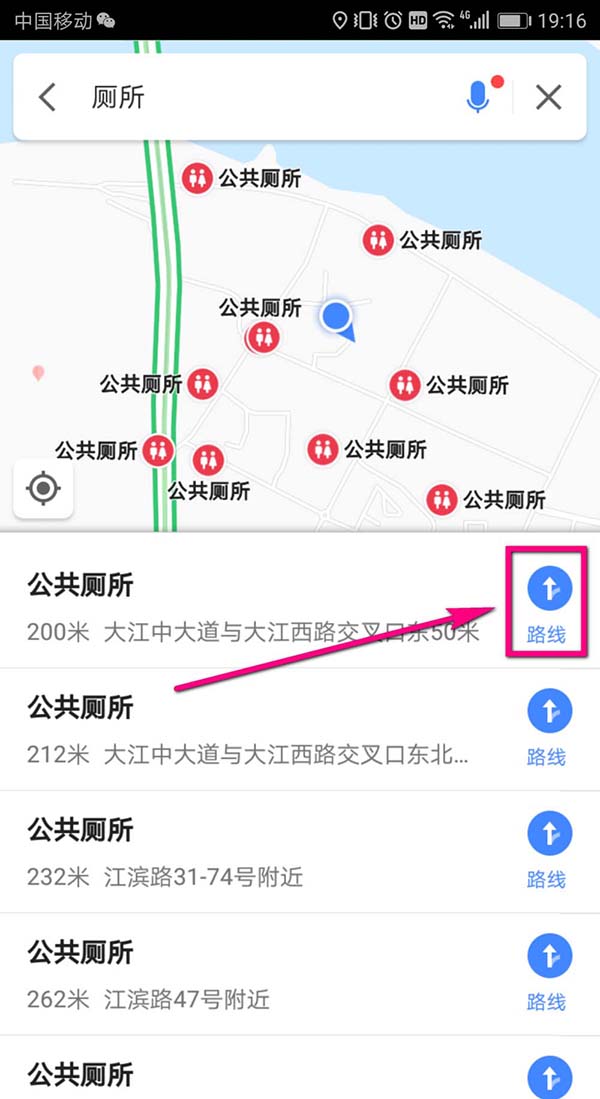 5、这样会在地图上显示出当前位置附近所有的厕所了,并且在屏幕的下半部分有一个列表,列表中显示了各个厕所距离自己的距离,在列表中选择一个你要去的厕所,点击其后方的【路线】图标。