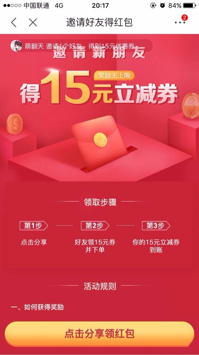 4、进去后,可以看到,发送自己的推广链接给好友完成下单后,你还可以获得15元的现金券哦。
