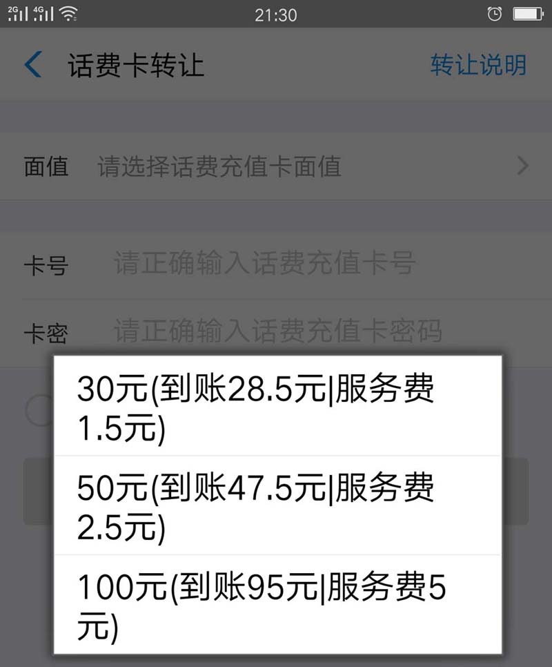 4、点击话费卡转让,进入到话费卡转让界面,如图