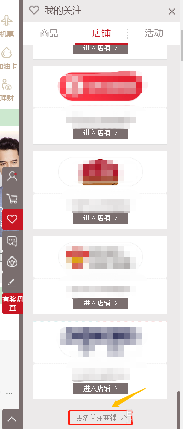 2、在此页面的中间位置可以看到"店铺关注"选项,点击进入以后是所有店铺的列表...