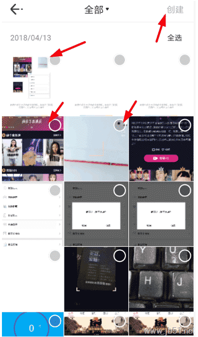 2、然后你需要将自己手机相册本地的图片进行选择,从中挑出要制作成为图片的那些,点击右上角“创建”功能。