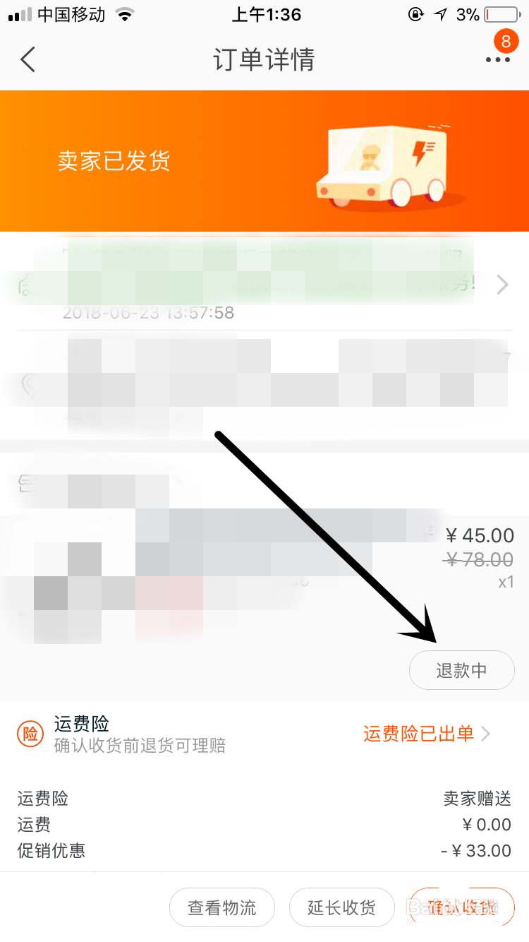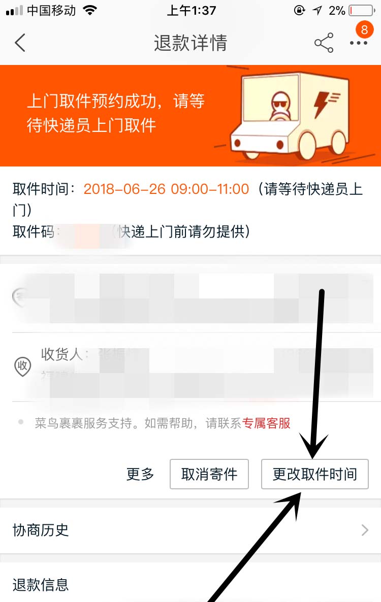 2、进入订单的详情页,可以看到有退款中,点击一下;就到了退款的详情页了;我们点击一下 更改取件时间;