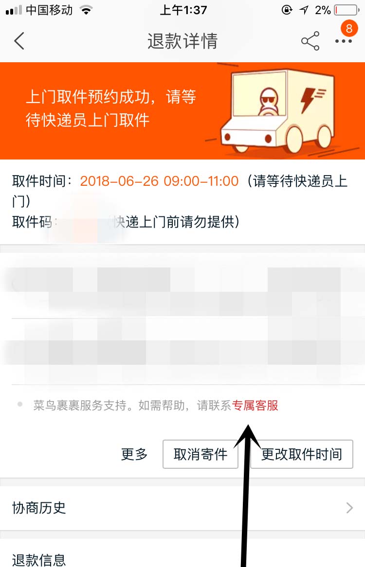 6、我们的操作就完成了。如果有问题,也可以咨询界面里的专属客服处,请求她的帮助。当然,有业务员接单了,我们还可以电话过去联系快递小哥,跟他说明具体的情况。