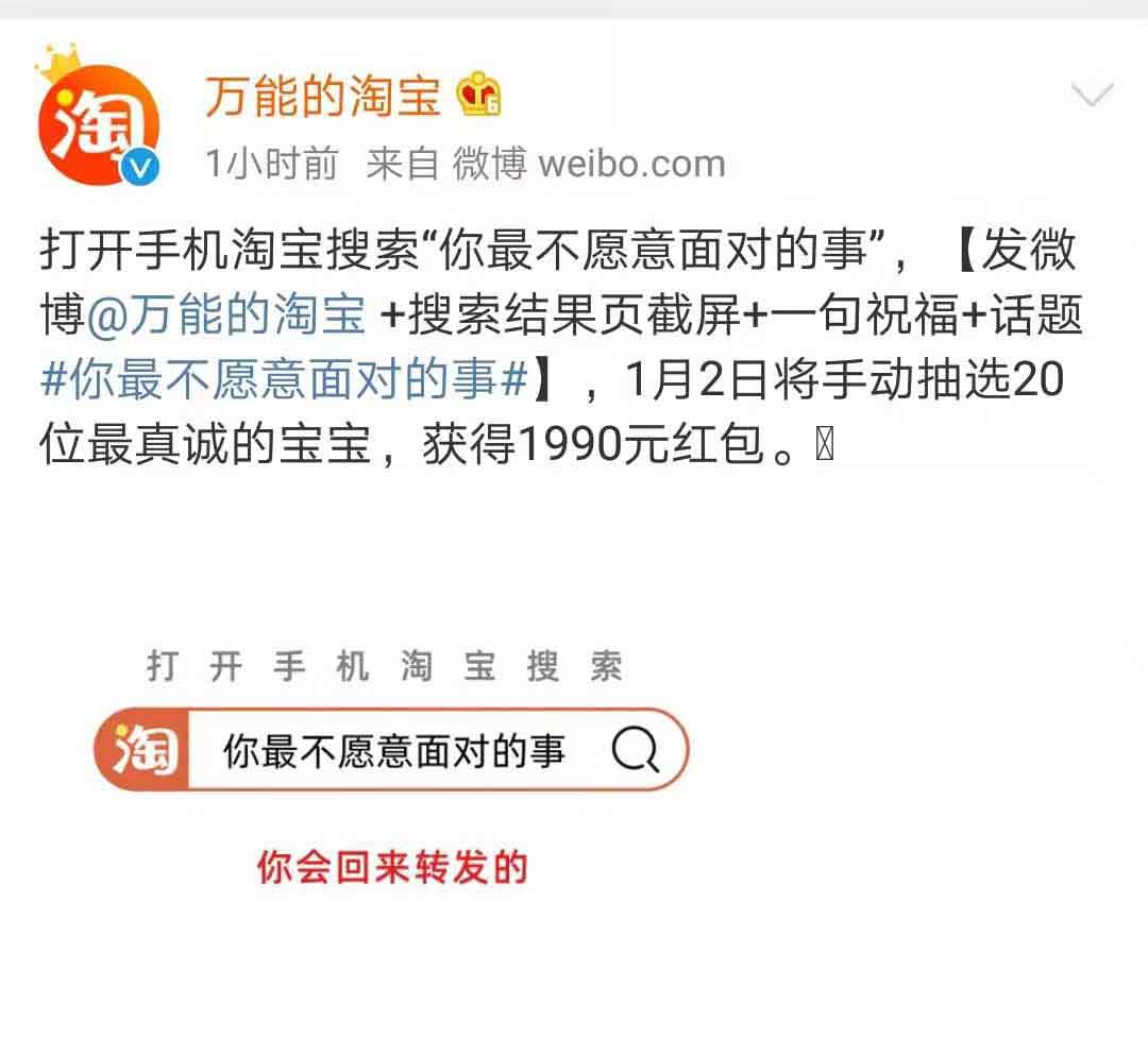 淘宝搜索"你最不愿意面对的事" 微博@万能的淘宝 赢1990元红包