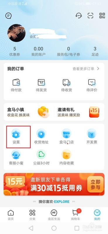 第一步打开盒马,进去我的界面之后,点击设置,如下图所示: