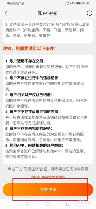 第五步进去注销账户界面之后,可以看到注销说明,点击同意注销,就成功注销账号了,如下图所示: