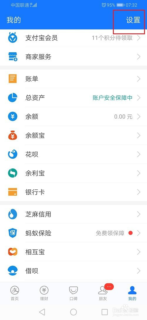 第二步打开支付宝,进去我的界面,点击设置,如下图所示: