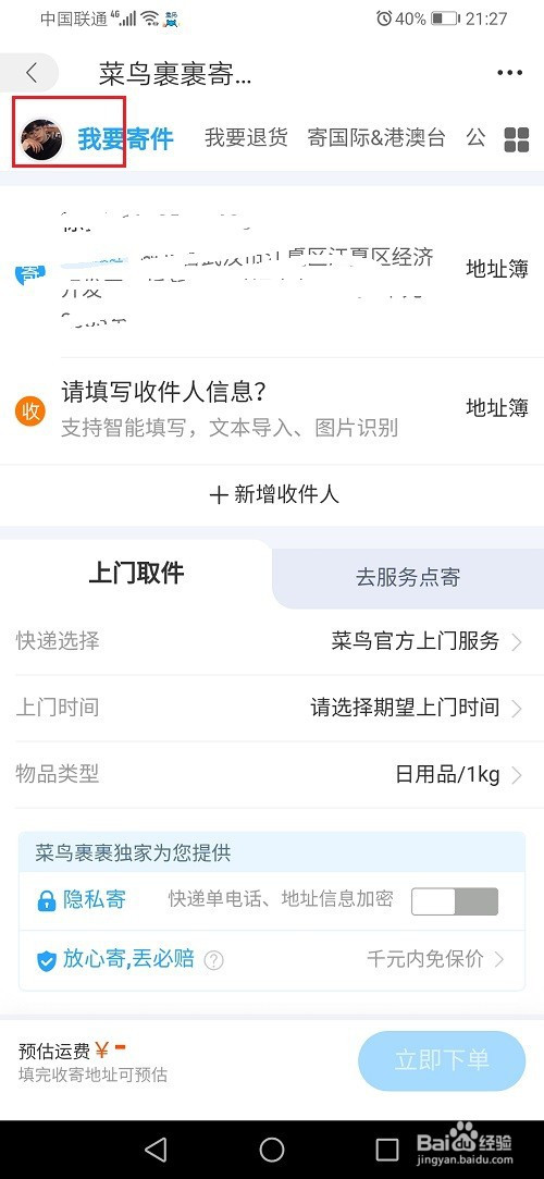 第一步打开菜鸟裹裹,进去我的界面之后,点击寄件,如下图所示: