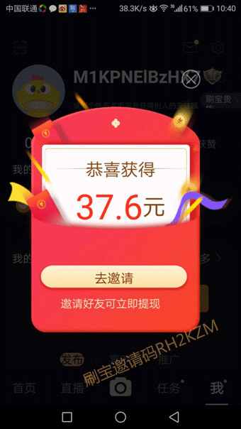第四步:输入验证码后会弹出一个37.6元的红包界面,哇!这多才不是呢,这是刷宝给你一年的红包额,需要你一年中天天刷才能领取到这钱,我们先关掉这个界面.