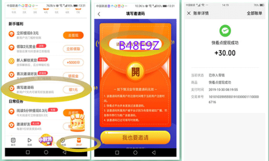 以上就是填写快看点邀请码的详细步聚,小编第一天邀请了身边的几个朋友试验了下,提现了30真的到账了,目前对快看点信心满满的,一起加油!