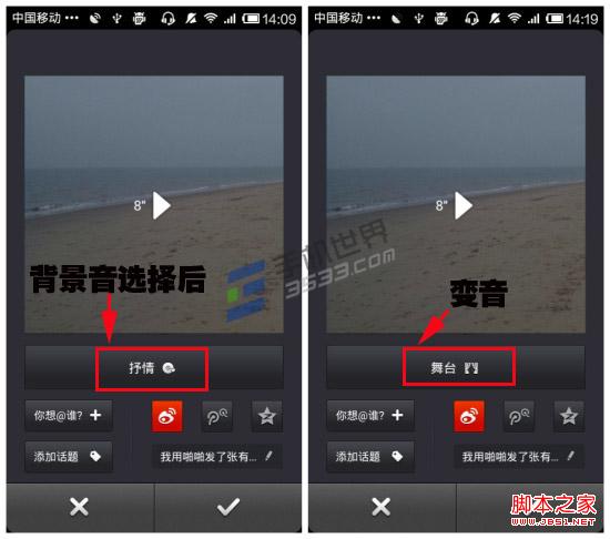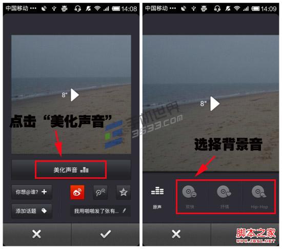 3)图片跟录音弄好后,可以在下图的界面进行设置,点击“美化声音”进入,可以选择“背景音”及“给现有的录音进行”变音。