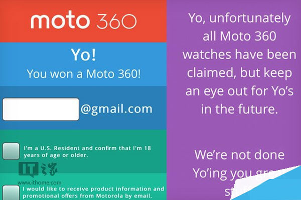 然而远远超过20个人收到了他们赢得了一款Moto 360智能手表的信息,但是当他们把电子邮箱地址填进表格的时候,却被告知所有的20部Moto 360都已经被认领了,这让很多用户非常失望。摩托罗拉和Yo相互指责对方的错误,但是摩托罗拉已经对此做出道歉,并且声明会对此进行补偿,他们会使用同样的方式再赠送20部Moto 360。