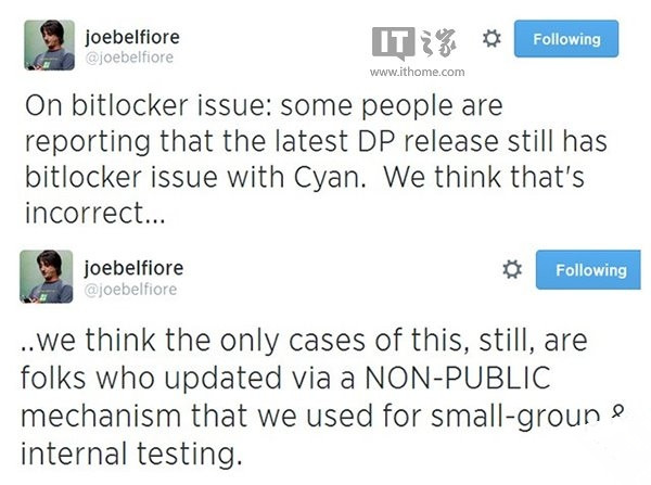 WP8.1预览版Bitlocker蓝屏仍有人遇到的问题,但是事实上呢?WP部门副总裁Joe@Belfiore 在Twitter上确认,因Bitlocker加密引起的升级蓝屏Bug已修复,认为出现的个例是由于直接从微软获取更新引起的。下面就一起来看看吧,希望可以对大家有所帮助的