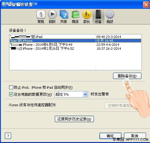 第二步,在偏好设置页面,点击进入“设备”选项。 第三步,在“设备偏好设置”页面,选择需要删除的设备备份,然后点击“删除备份”。