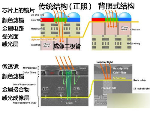 首先我们先来看一看现在普遍流行的背照式传感器和传统型的之间有什么不同。传统型摄像头的传感器的整个光电二极管位于感光芯片的最下层,传感器的A/D转换器和放大电路位于光电二极管的上层位置,所以光电二极管到透镜的距离是比较远的,光线到达要求也会更加高。