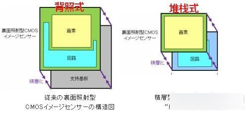 而现在,国内外众多手机生产厂商的旗舰智能手机的摄像头都纷纷采用了堆栈式的传感器,那么相比起背照式传感器的摄像头,堆栈式传感器又有哪些不同呢?其 实,堆栈式传感器是由背照式所发展而成的,由上图可以看出,背照式传感器是将感光层的光电二极管的位置换了一下,而堆栈式传感器则是把信号回路位置互换。 而且,堆栈式传感器比背照式的的体积更加小,画质方面也是作了更加好的优化。