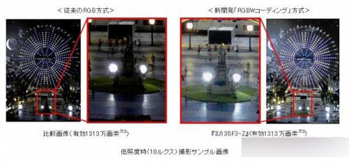 除此之外,堆栈式传感器相比起背照式的还拥有两项技术来提升画质的。第一个就是堆栈式传感器加入了RGBW的编码技术,就是是由原来的 R(红),G(绿),B(蓝)三原色像素点中再加入W(白)像素点来提升画质,提高传感器的感光能力的,使摄像头在暗光环境下也能够拍摄出质量更高的照片。