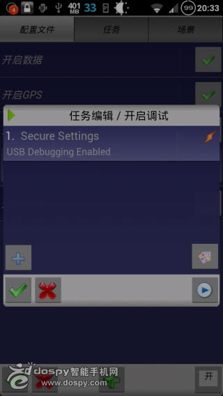 接下来添加操作→插件→Secure Settings→USB Debugging→On: