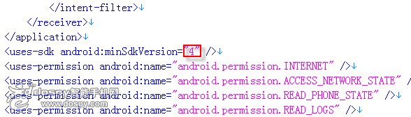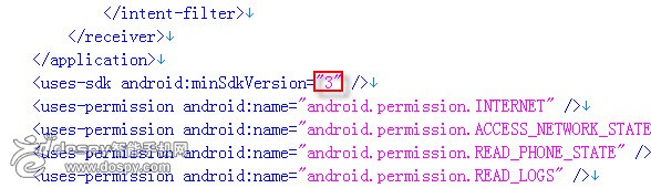 那么,这是怎么做到的呢?很简单,只要给apk文件做个小手术,改动一个数字就能实现。对,就是改动一个数字。具体而言,我们要做的只是用apktool解包apk文件,用文本编辑器打开AndroidManifest.xml这个文件,找到minSdkVersion这一行,将等号后面的数字由3改为4,就这么简单。以下是“历史每天回顾”里的AndroidManifest.xml文件代码:
