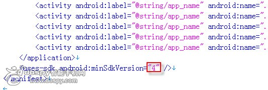 虽然minSdkVersion出现的位置不一样,但找到后同样果断将其数值改为4即可: