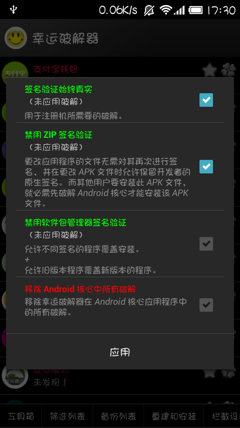 重启下手机,再打开幸运破解器的核心破解,勾“移除 Android 核心中所有破解”,按“应用”重启。