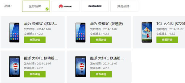 首批可通过刷机精灵一键刷入抢先体验乐蛙OS6的机型有:华为荣耀3C(移动2G版)、华为荣耀3C(联通版)、酷派大神F1移动版(8297)、酷派大神F1联通版(8297W)、TCL么么哒(S720T)。