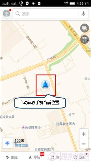 2、进入【高德地图】后,会自动定位到手机所在位置(建议开启数据连接以及GPS功能),如下图;