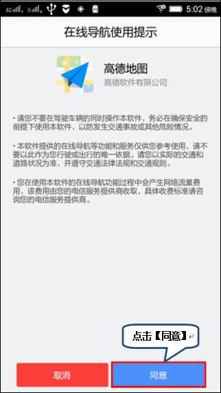 6、在弹出的【在线导航使用提示】中点击【同意】后即可实现导航,如下图;