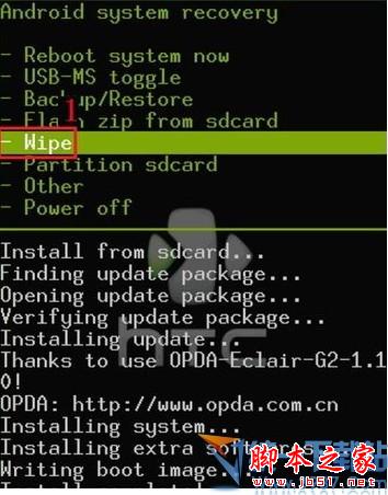 1、进入recovery菜单后,选择第五项“wipe”。