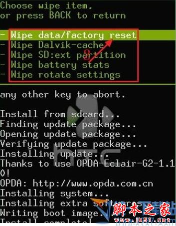2、选择“wipe”选项后,会出现如下界面。其中第一项是恢复手机出厂值,第二项是清除缓存,第三项是清除SD卡的第二分区内容,第四项是清除电池使用记录,第五项是清除重力感应设置。点击第一项会弹出提示,按Home 房子键即可开始恢复出厂设置。